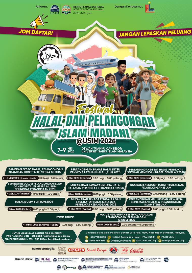 Muzakarah Tenaga Pengajar Halal dan Fasilitator Halal Malaysia Peringkat Kebangsaan 2026 sempena Festival Halal dan Pelancongan Islam Madani @USIM 2026 yang akan diadakan seperti ketetapan berikut: