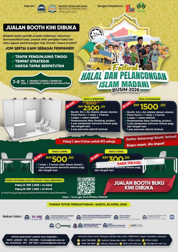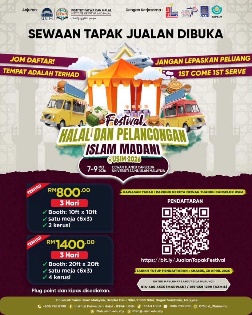 Sewaan tapak jualan bagi Festival Halal dan Pelancongan Islam Madani @USIM 2026 kini dibuka!