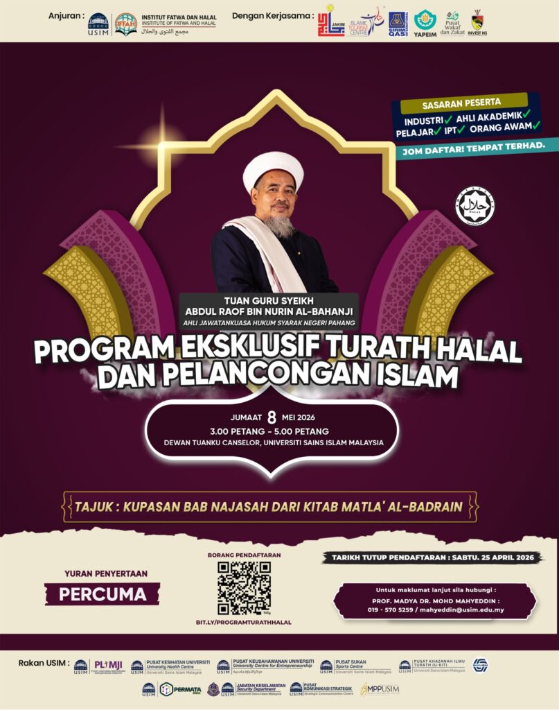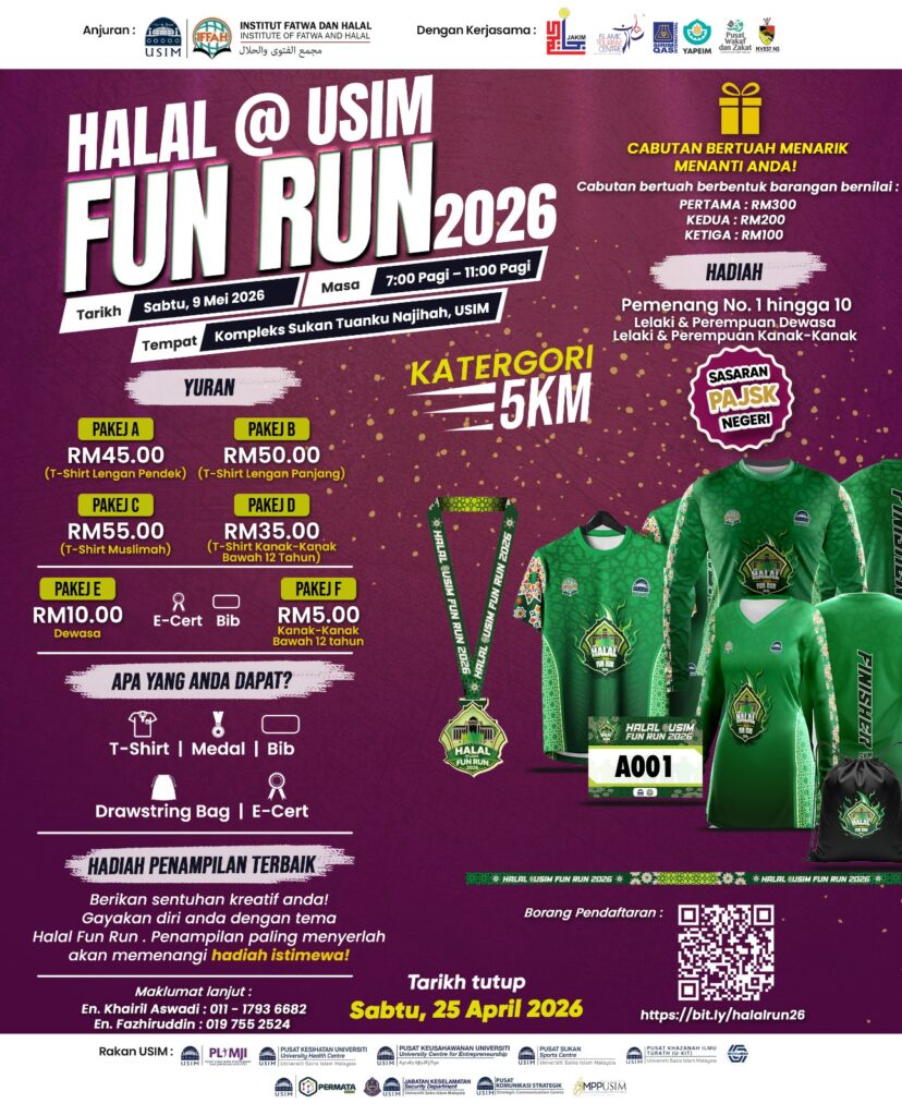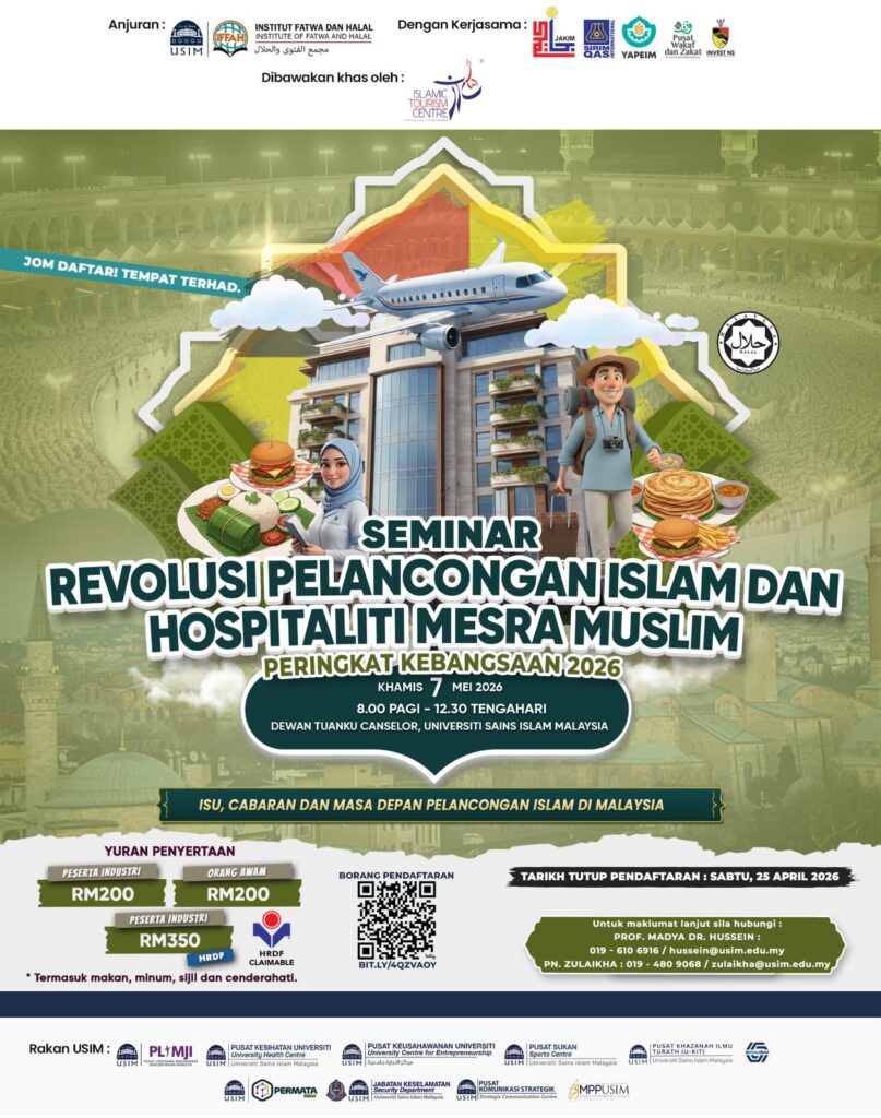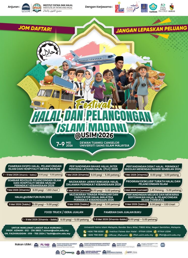 Sukacita dimaklumkan bahawa Institut Fatwa dan Halal (IFFAH), Universiti Sains Islam Malaysia (USIM) dengan kerjasama Jabatan Kemajuan Islam Malaysia (JAKIM) akan menganjurkan FESTIVAL HALAL DAN PELANCONGAN ISLAM MADANI@USIM 2026 seperti ketetapan berikut: