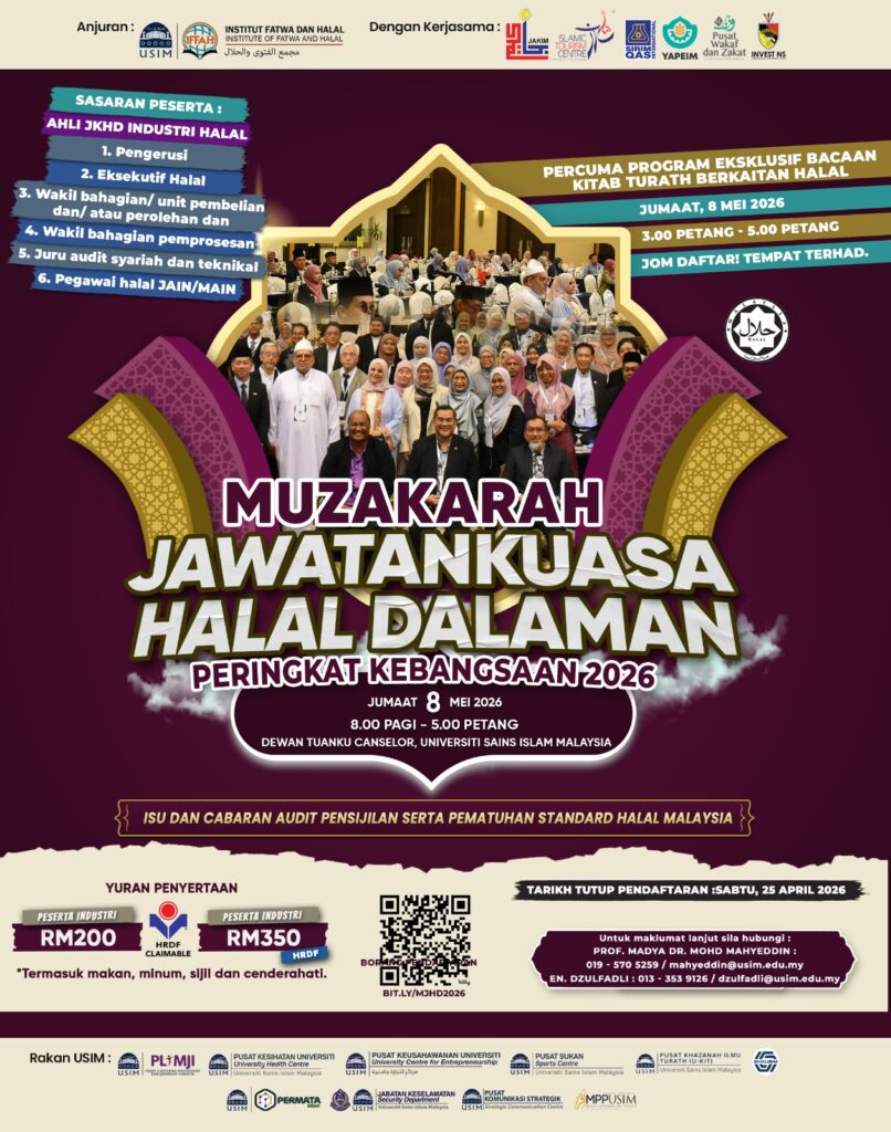 Muzakarah Jawatankuasa Halal Dalaman Peringkat Kebangsaan 2026 sempena Festival Halal dan Pelancongan Islam Madani @USIM 2026 yang akan diadakan seperti ketetapan berikut:
